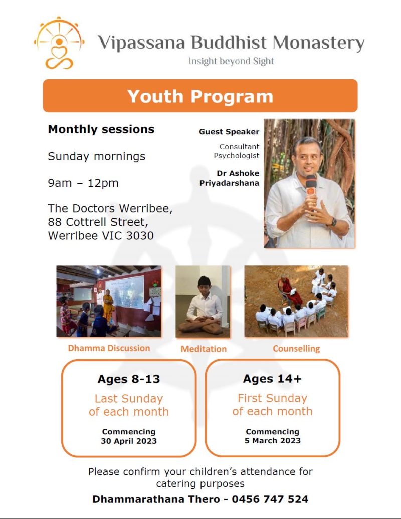 "Vipassana Buddhist Monastery (VBM) was founded in 2018 to facilitate and guide those who wish to practice meditation and understand Buddhist philosophy. Also, not just bounded to day-to-day Buddhist practices, VBM focused on inner peace, managing stress, work and life balance etc. Moreover, VBM conducts Dhamma discussions, and Dhamma talks, observing Sil and Meditation practices from beginners to in-depth and targeting various age groups.